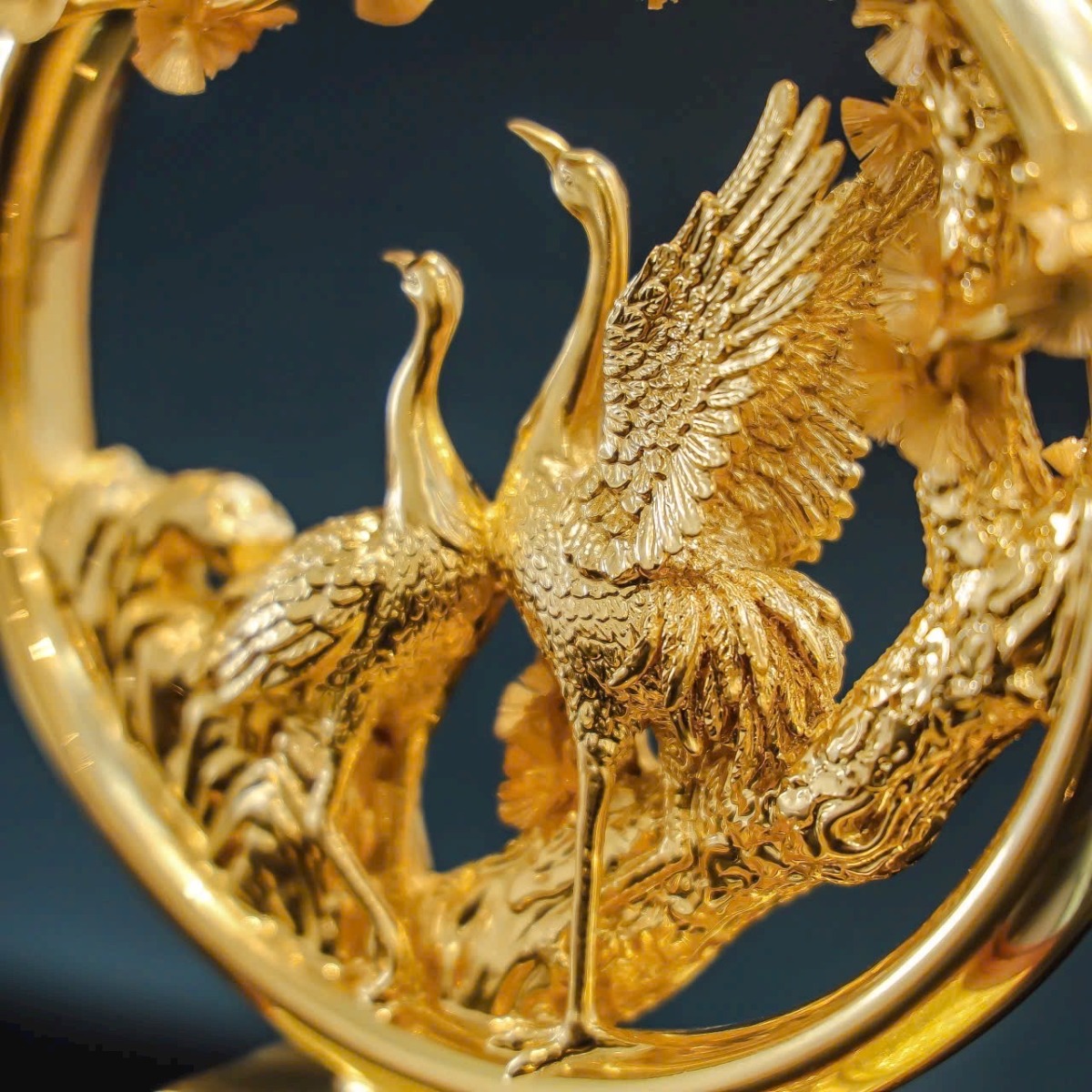 Tranh tùng hạc diên niên được dát vàng 24K nguyên chất. Khác với các loại tranh đá hoặc tranh gỗ tùng hạc diên niên, chất liệu đồng nguyên chất và lớp bề mặt được dát vàng khiến sản phẩm có một vẻ sang trọng cao cấp đặc biệt.